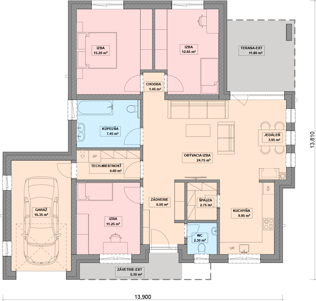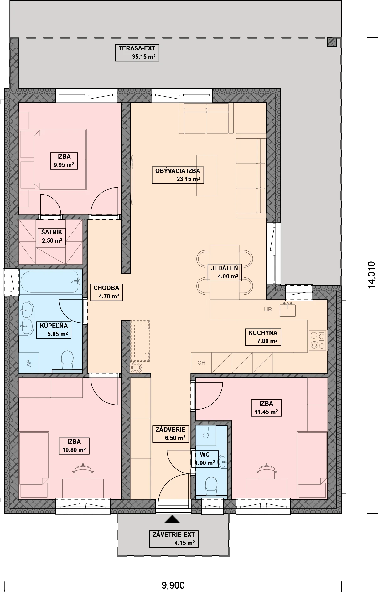 Celá rodina si užije oddych na priestrannej terase. Rodinné domy s plochou strechou, resp. rovnou strechou sú jedinečným a zaujímavým riešením, ako získať nevšedný a moderný vzhľad domu. Vďaka pozdĺžnej dispozícii sú ideálne pre úzky typ pozemku. Samostatný šatník je snom snáď každej ženy, do ktorého sa pohodlne zmestí všetko oblečenie. Dodatočná toaleta poteší nielen návštevy.