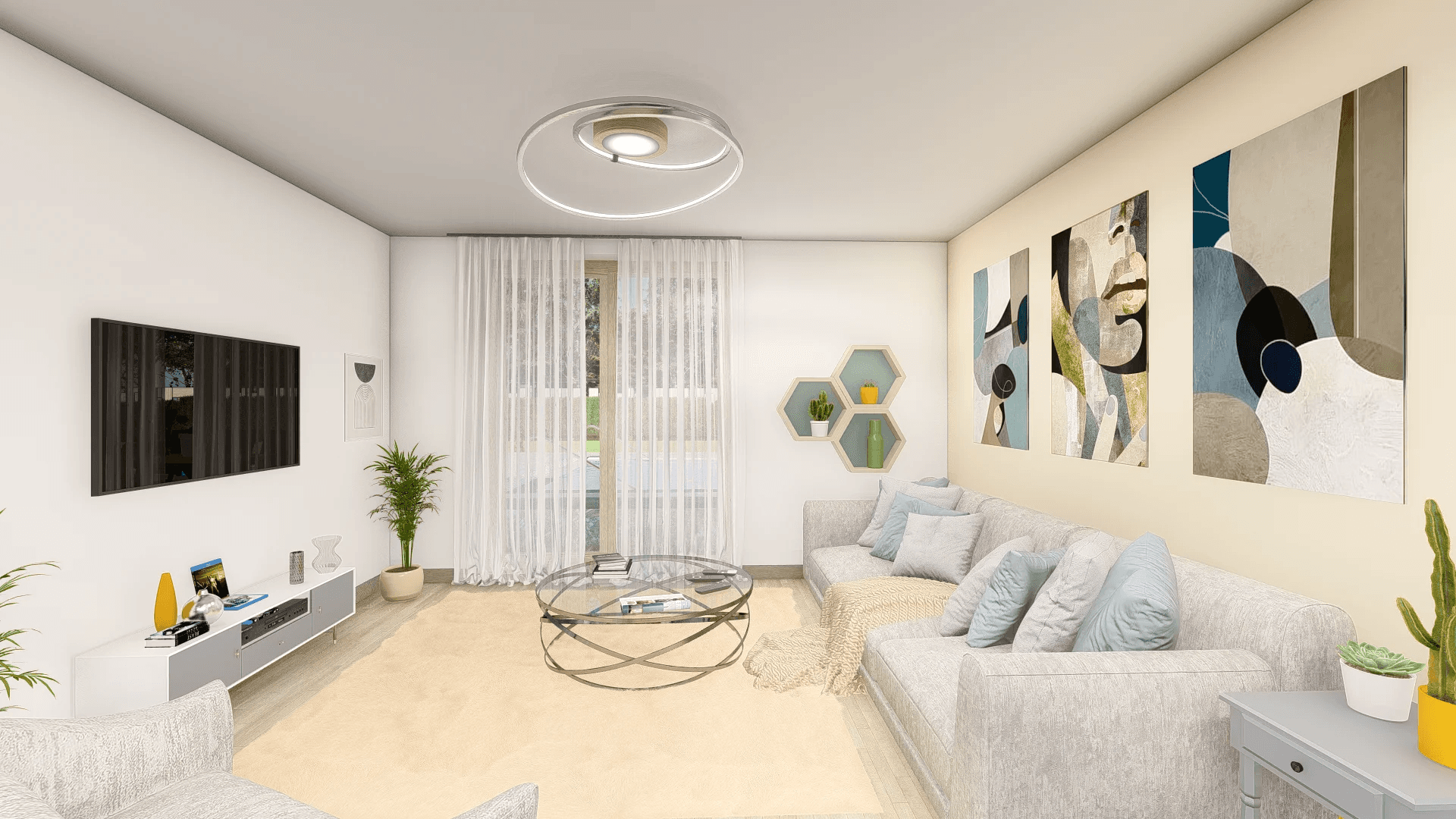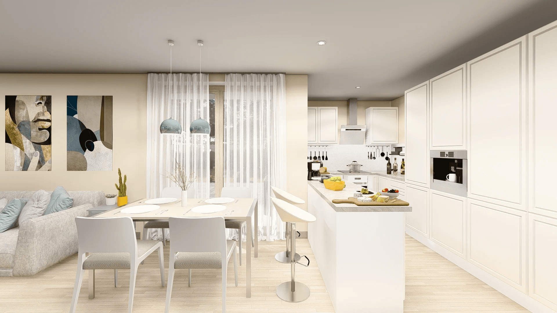 Súčasťou priestranného obývacieho priestoru je aj americká kuchyňa, ktorú možno vybaviť kuchynským ostrovom. Táto forma kuchyne je veľmi moderná a ponúka veľkú tvorivú slobodu pri varení. Dizajn domu je obohatený aj o veľké sklenené plochy v obývacej izbe, ktoré zaručujú krásne presvetlené priestory.